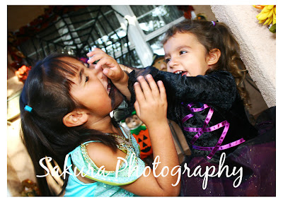 This is Miss R and Miss H, aka the adorable purple witch and belly button Jasmine. I stopped by their grandma’s house last week, which was decorated with pumpkins and spider webs and scarecrows. Here’s a glimpse of their conversation.